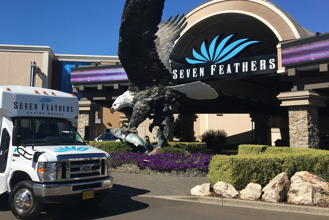 Complimentary shuttle buses to Seven Feathers Casino Resort from Canyonville businesses.