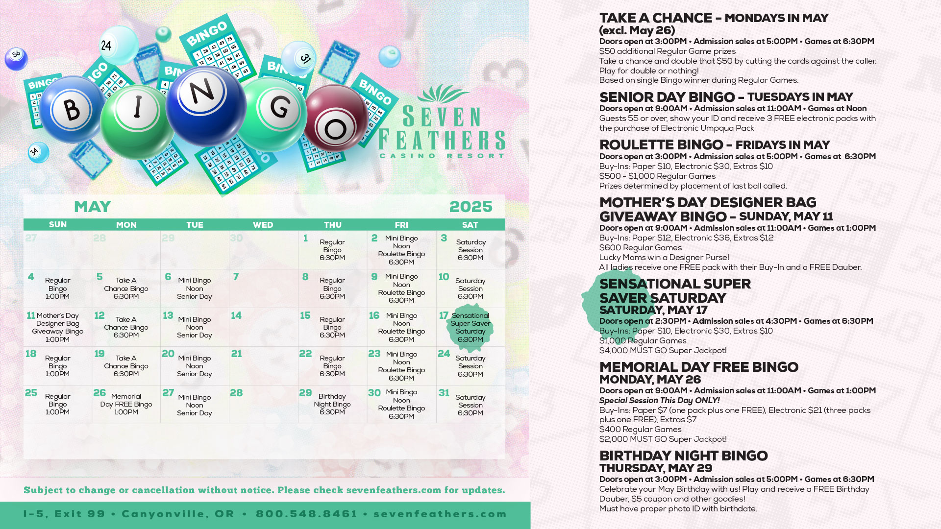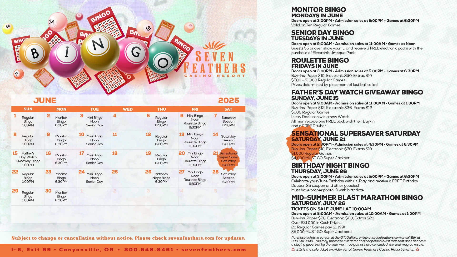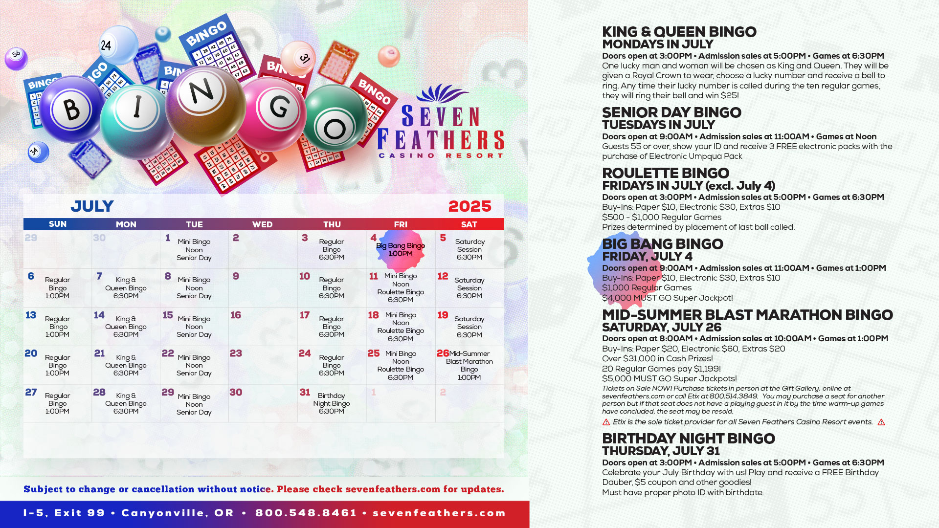 Bingo, the game that started it all at Seven Feathers! You can play Bingo at Seven Feathers six days a week. Plus, we have monthly Bingo events you won’t want to miss. With seasonal and holiday-themed events, Birthday Night Bingo and more, there are always new ways to win! Ready your daubers, line up your lucky charms and get ready to WIN BIG! Seven Feathers Casino Resort is your place to play!