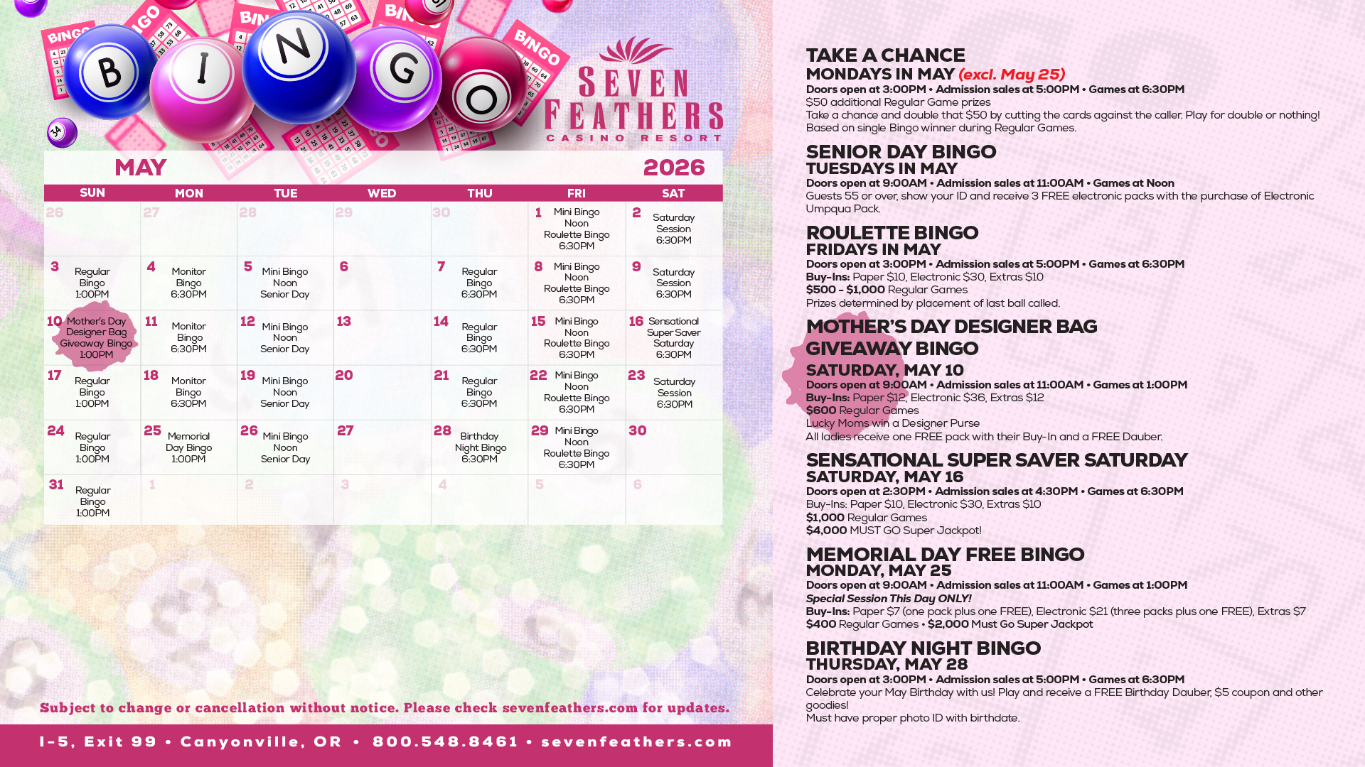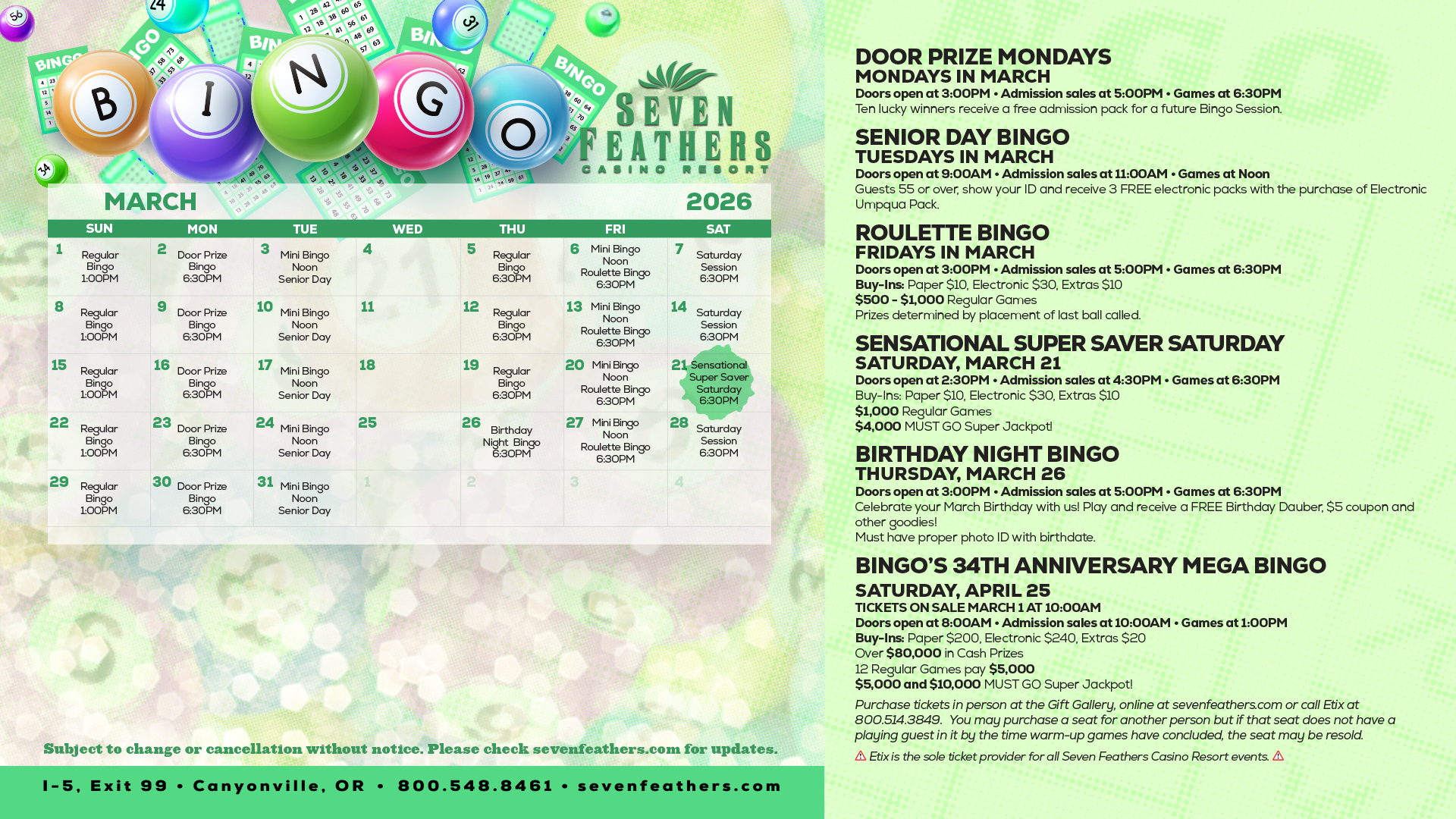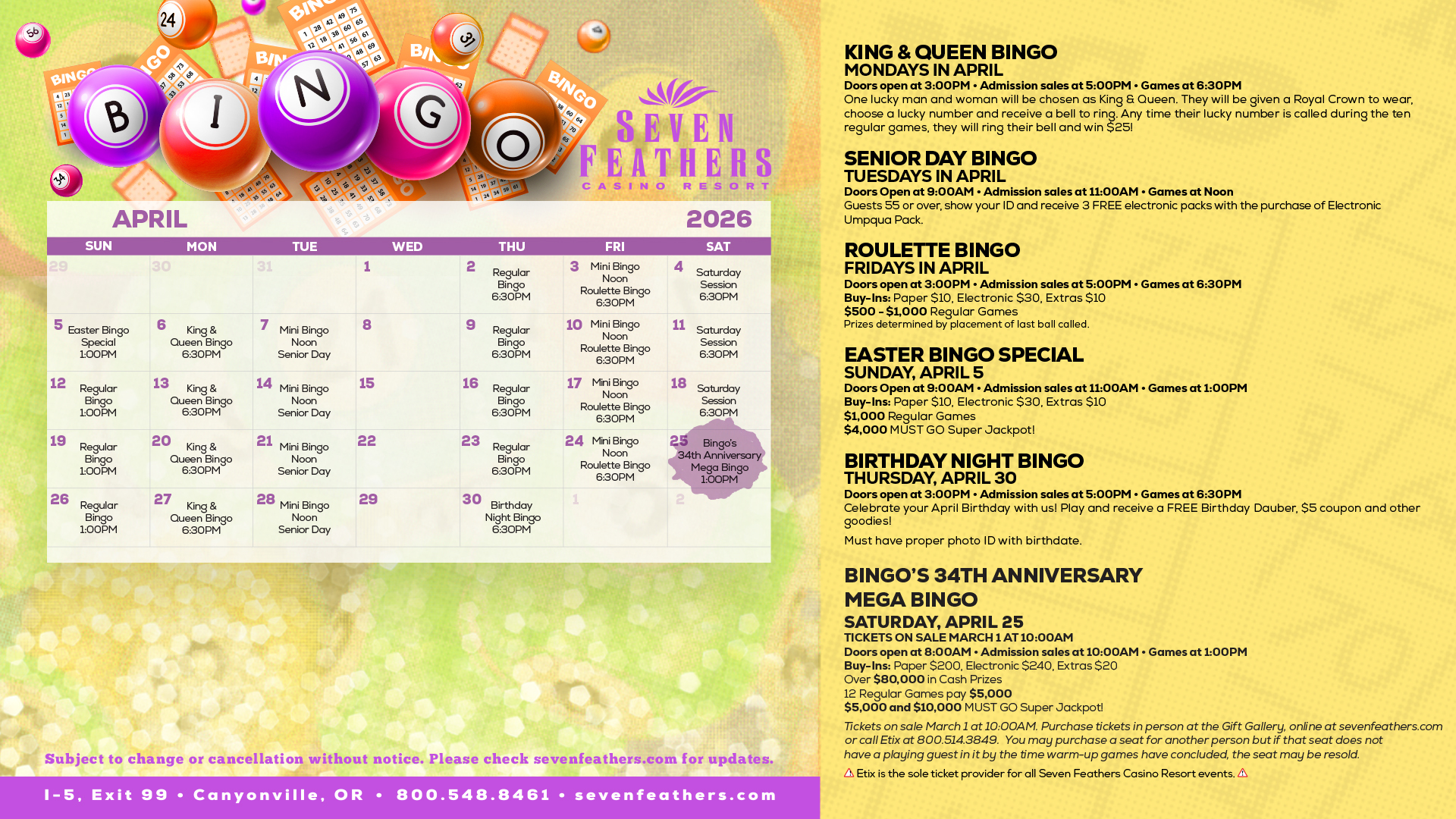 Bingo, the game that started it all at Seven Feathers! You can play Bingo at Seven Feathers six days a week. Plus, we have monthly Bingo events you won’t want to miss. With seasonal and holiday-themed events, Birthday Night Bingo and more, there are always new ways to win! Ready your daubers, line up your lucky charms and get ready to WIN BIG! Seven Feathers Casino Resort is your place to play!