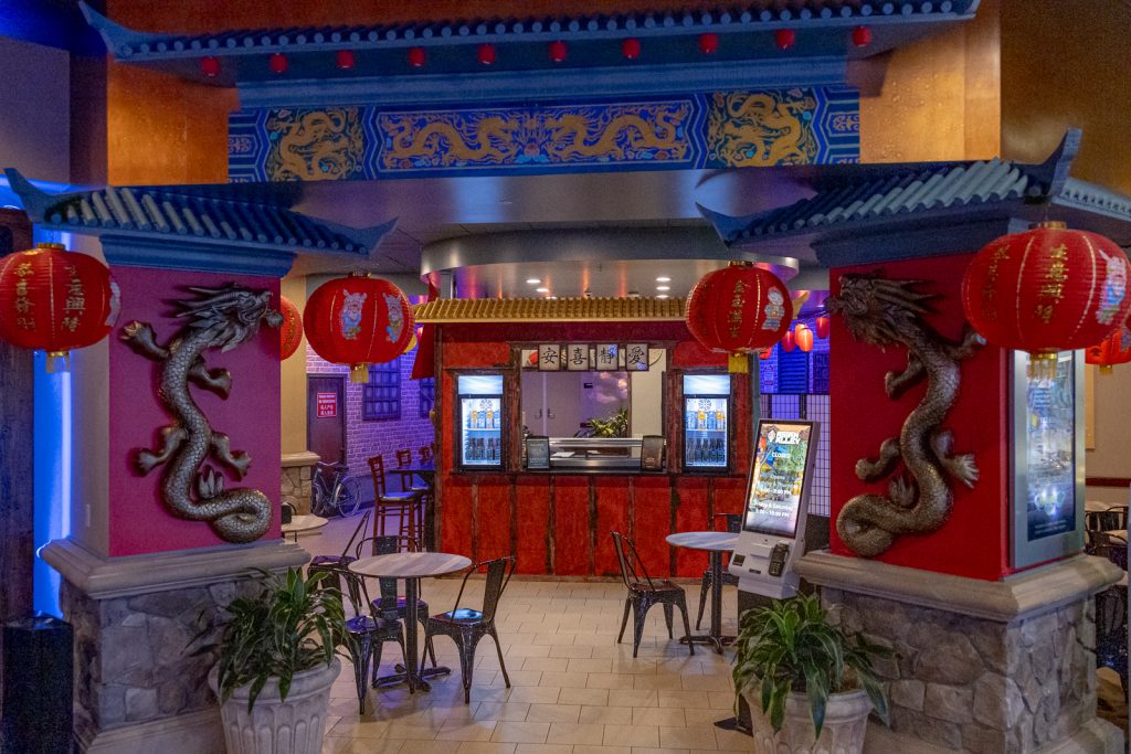Every detail of Asian Alley is crafted to transport you. From iconic paper lanterns to striking dragon motifs and intricate East Asian decor, the space buzzes with visual charm. The ordering windows are part of the experience. Each side is styled as a different market scene: a street food truck, a traditional Chinese fishing boat, and a lively open-air market stall. Whether you’re grabbing a quick bite between games or exploring new flavors on your vacation, Asian Alley offers a delicious, dynamic escape.