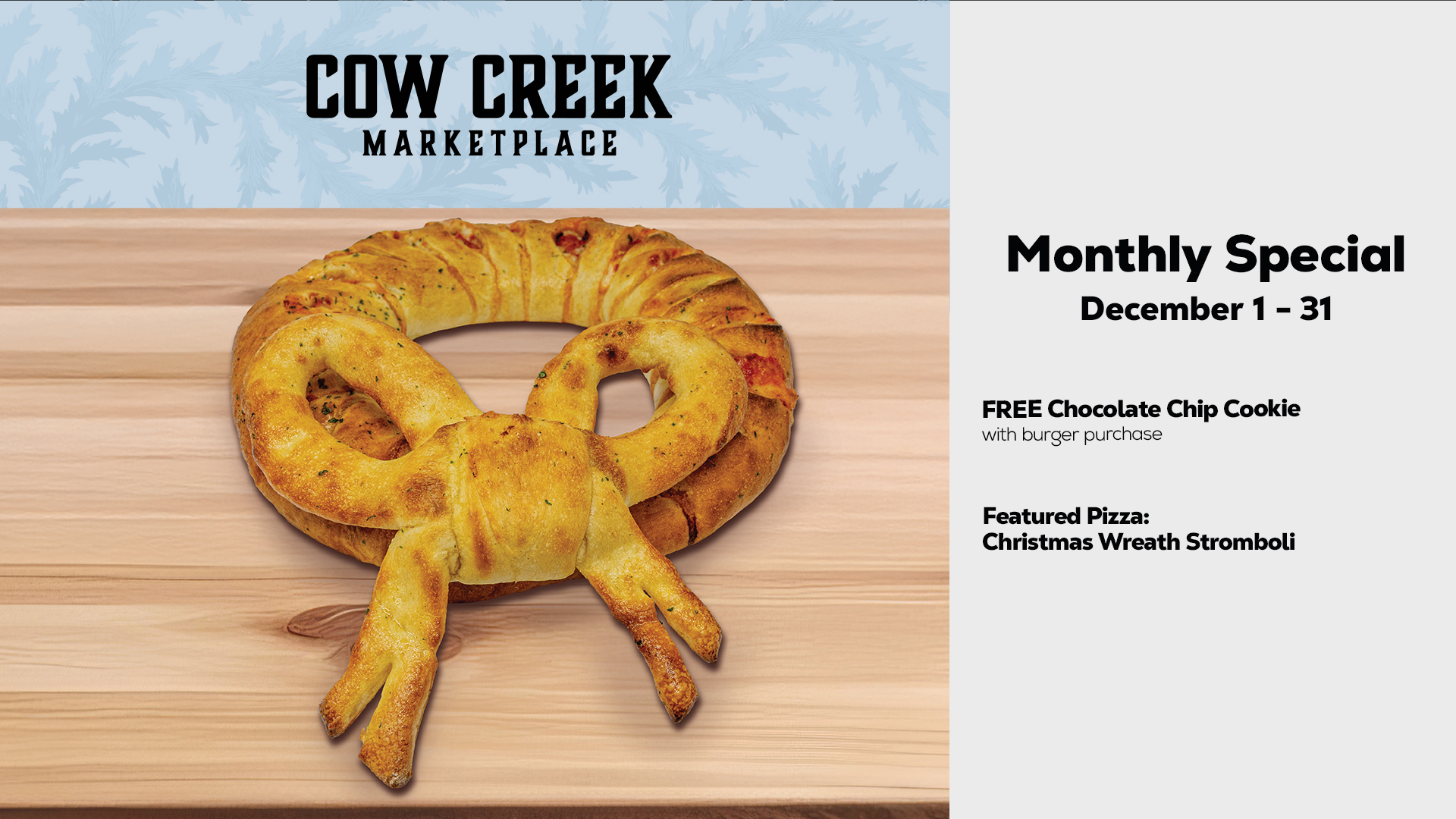 Enjoy a Christmas Wreath Stromboli and as always receive a free chocolate chip cookie with the purchase of a burger!