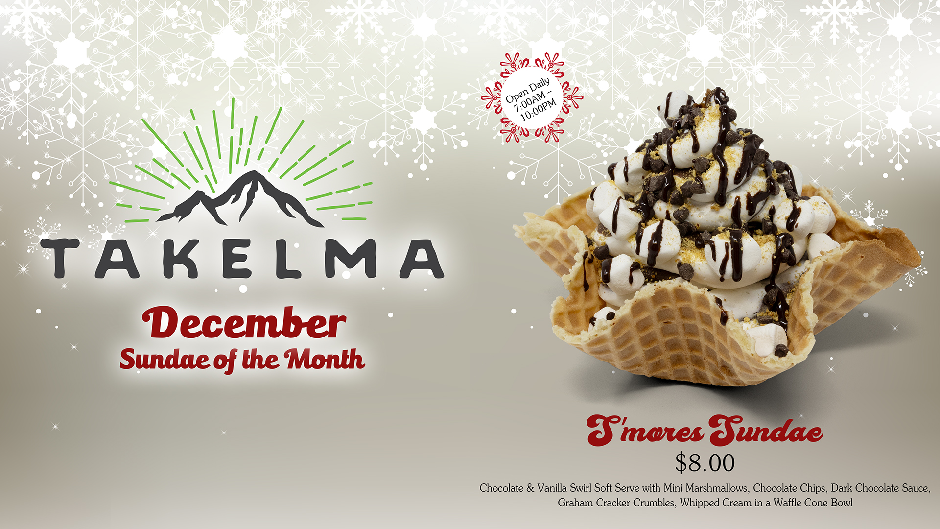 Our S’mores Sundae features chocolate & vanilla swirl soft serve with mini marshmellows, chocolate chips, dark chocolate sauce, graham cracker crumbles, and whipped cream in a waffle cone bowl. $8.00