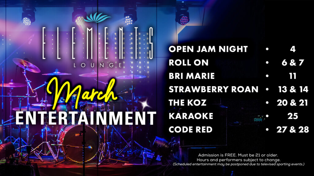 Be our guest and enjoy free live music in the Elements Lounge! Strawberry Roan will be performing live June 11 – 14!